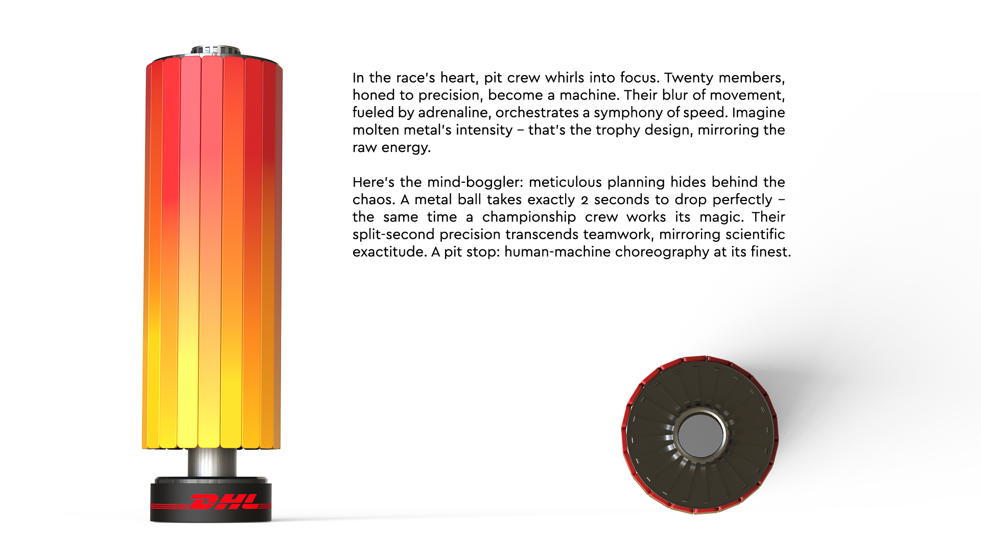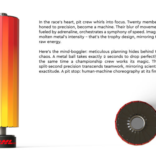Torq captures the raw, intense energy of the race, inspired by the high-speed ballet of the pit crew. The design mirrors molten metal, embodying the split-second precision and adrenaline that turns twenty individuals into a perfect machine. It is a monument to scientific exactitude, symbolizing the critical two-second window—the time a championship crew needs to execute its magic. More than a trophy, it represents human-machine choreography at its absolute finest, celebrating perfect planning hidden within the chaos.